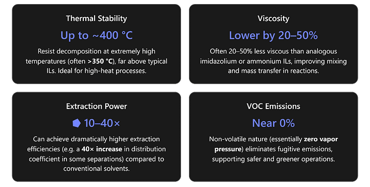 Leveraging the above traits, phosphonium ILs have proven especially effective in several areas of chemistry and chemical engineering:
