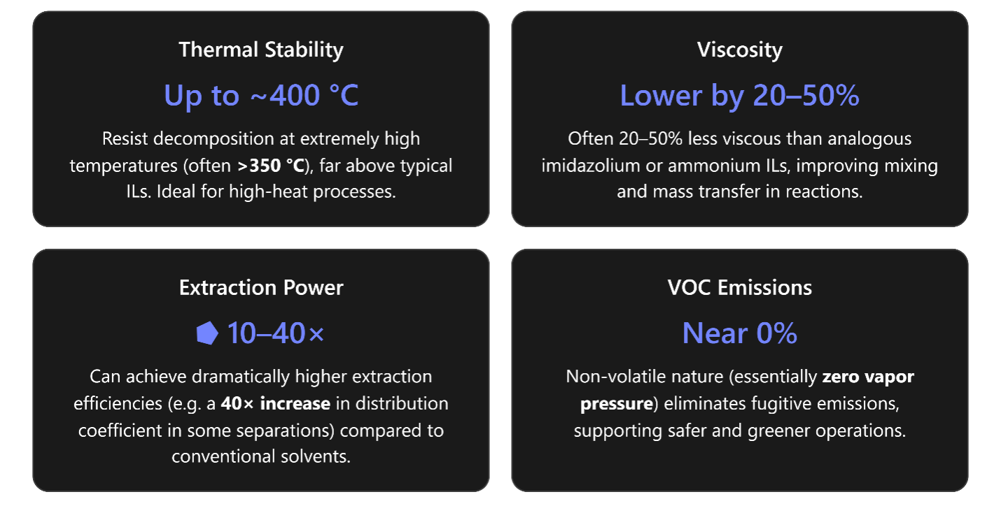 - Sustainability Perks: Aside from performance, phosphonium ILs contribute to greener chemistry in several ways. Their near-zero vapor pressure means negligible VOC emissions – an IL can often replace a volatile organic solvent and thereby cut out a major source of air pollution and health hazard. This has a concrete impact: for example, an extraction or reaction using an IL emits virtually no fumes, whereas an equivalent process with hexane or dichloromethane would. Moreover, phosphonium ILs are typically recyclable; after use, they can be recovered (by distilling off products or by washing) and reused in subsequent runs. Industrial trials have shown that with proper setup, IL losses can be minimized and the same batch reused many times, dramatically reducing the total waste generation. They also enable energy-efficient process redesign: one can often carry out reactions and separations in ILs at mild conditions (because the IL can hold a catalyst or reagent in solution, or eliminate steps) that would otherwise require more energy or yield more waste. Finally, ongoing research indicates that many phosphonium ILs can be made with lower toxicity and biodegradability in mind (for instance, by selecting appropriate anions). All these factors position phosphonium ILs as tools for not only boosting performance but also for aligning with sustainability and green chemistry goals. [link.springer.com] [cdn.intechopen.com]